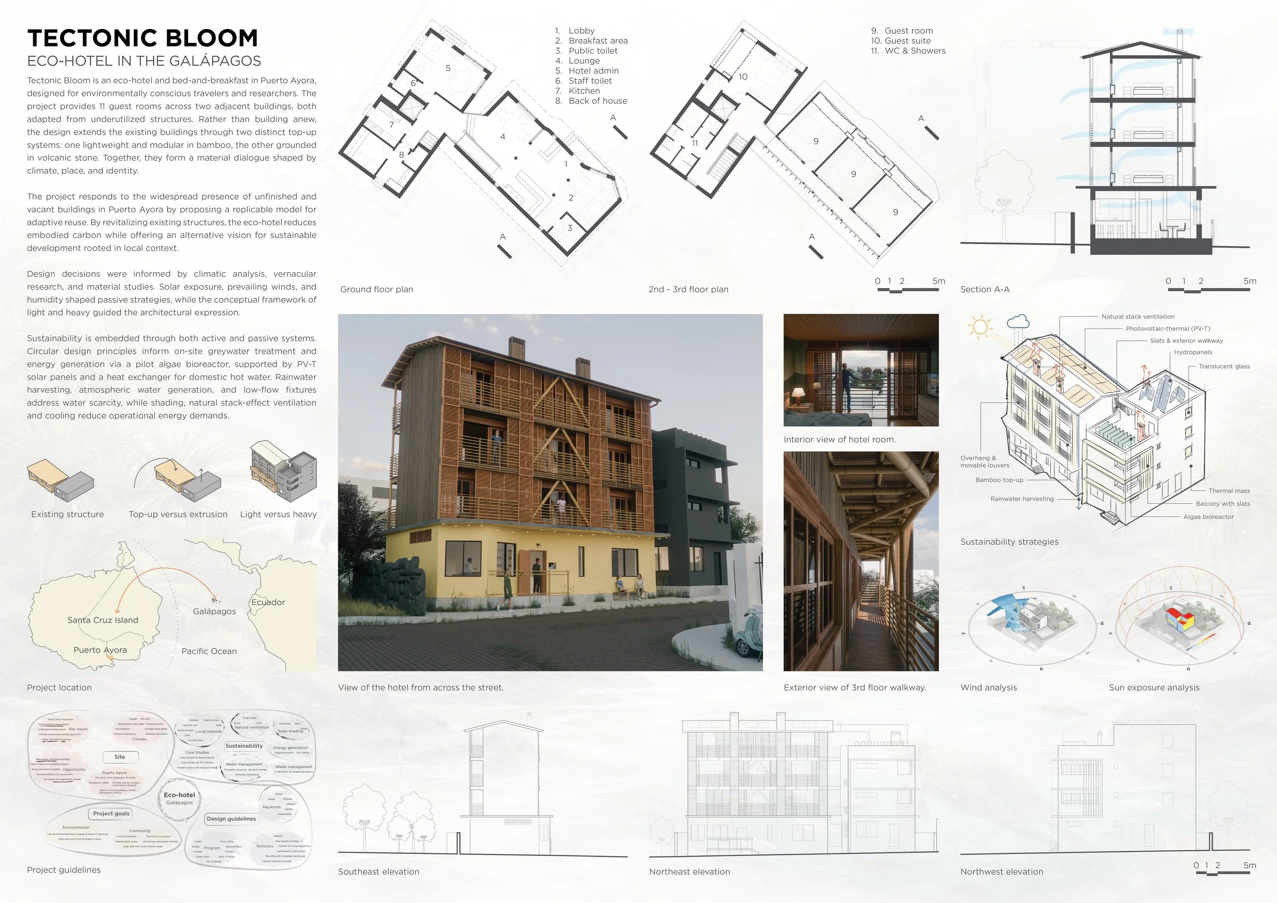 Tectonic Bloom is an eco-hotel and bed-and-breakfast in Puerto Ayora, designed for environmentally conscious travelers and researchers. The project provides 11 guest rooms across two adjacent buildings, both adapted from underutilized structures. Rather than building anew, the design extends the existing buildings through two distinct top-up systems: one lightweight and modular in bamboo, the other grounded in volcanic stone. Together, they form a material dialogue shaped by climate, place, and identity.